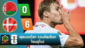 - บ้านผลบอล สรุปหลังเกม ฟุตบอลโลก รอบคัดเลือก ยูฟ่า เดนมาร์กบุกถล่มเบลารุส 6-0 “ฮอยลุนด์” โชว์ฟอร์มพระเอก ยิงแฮตทริกสุดเฉียบ!