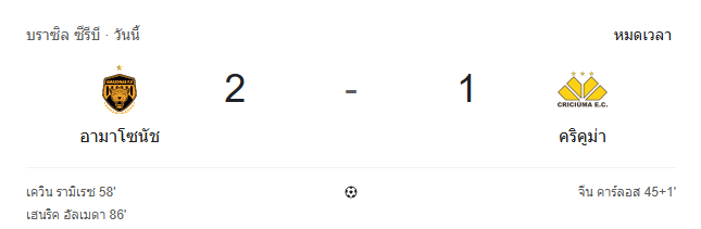 - จบครึ่งแรก: อมาโซนิซ ตามหลัง คริซิอูม่า 0-1 จากประตูของ Jean Carlos