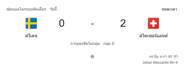- หมดเวลา: 🇸🇪 สวีเดน 0–2 🇨🇭 สวิตเซอร์แลนด์