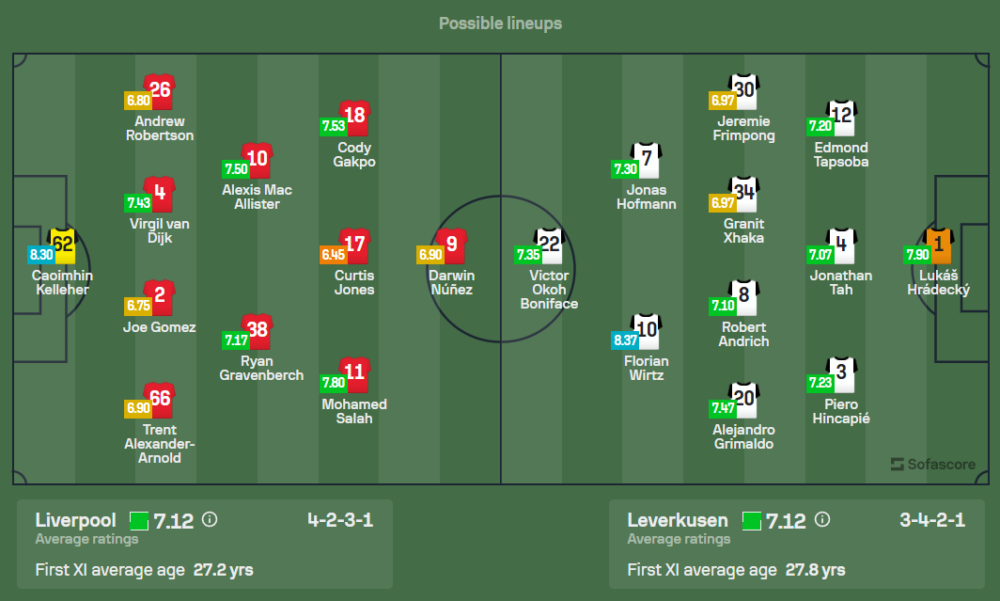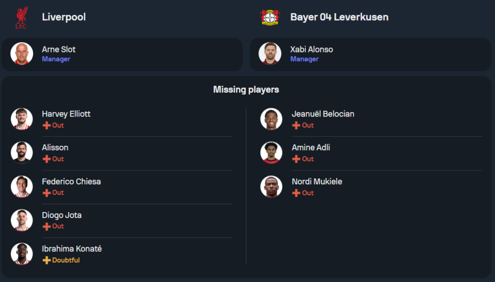 ด้านทีมเยือน ไบเออร์ เลเวอร์คูเซ่น ภายใต้การนำของ ชาบี อลอนโซ่ ก็ไม่แพ้ใครมา 11 เกมติดเช่นกัน โดยทีมไม่มีปัญหาผู้เล่นบาดเจ็บหรือติดโทษแบนเพิ่มเติม นัดนี้คาดว่าพวกเขาจะใช้แผน 3-4-2-1 โดยมี อเล็กซ์ การ์เซีย และ มาร์กแต็ง เทร์ริเย่ร์ ที่ฟิตพร้อมคืนสนาม ทั้งนี้พวกเขาจะใช้ผู้เล่นหลักอย่าง วิคเตอร์ โบนิเฟซ, ฟลอเรียน เวียร์ตซ์ และ กรานิต ชาก้า ในเกมรุก หวังทำประตูที่สนามแอนฟิลด์ให้ได้