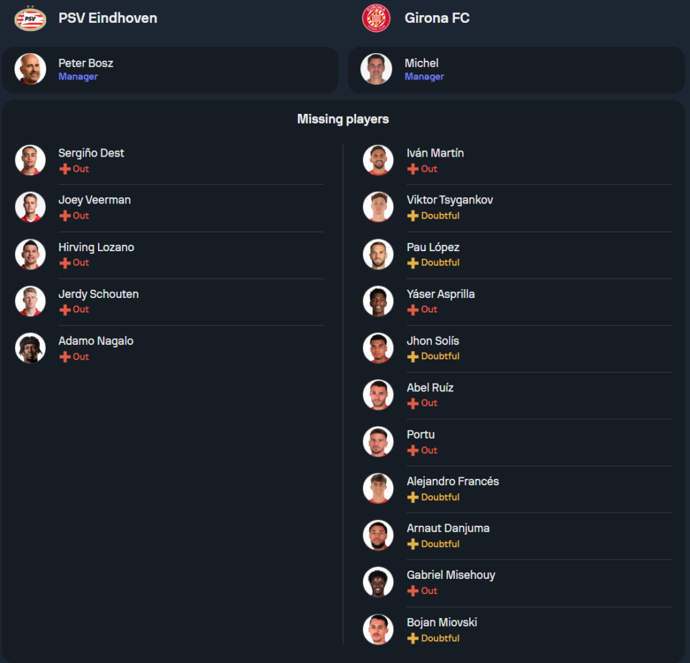 ทางด้าน คิโรน่า แม้จะมีฟอร์มที่ดีในลีก แต่การเจอกับคู่แข่งที่มีมาตรฐานสูงกว่าในรายการยุโรปยังเป็นปัญหา และพวกเขายังขาดประสบการณ์ในแชมเปียนส์ลีก โดยเกมเยือน 5 นัดหลังสุดพวกเขาแพ้ไปถึง 3 ครั้ง ซึ่งต้องทำการปรับทีมและเน้นเกมรับมากขึ้นในการเจอศึกหนักกับ พีเอสวี