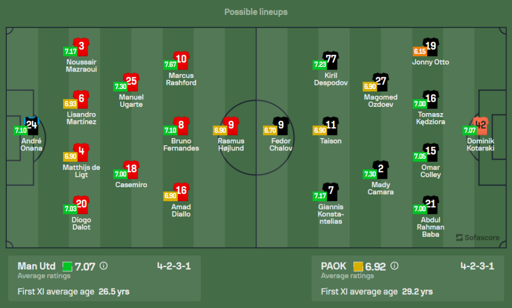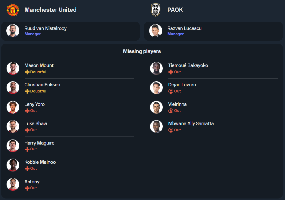 แมนเชสเตอร์ ยูไนเต็ด: การจัดทัพครั้งนี้ รุด ฟาน นิสเตลรอย ทำหน้าที่กุนซือรักษาการและจะได้ลงสนามเป็นนัดที่สาม ก่อนจะมอบหน้าที่ต่อให้ รูเบน อโมริม แมนยูได้รับข่าวดีเมื่อ เมสัน เมาท์ และ เลนี่ โยโร่ ฟื้นตัวและเริ่มซ้อมได้แล้ว มีโอกาสที่จะได้ร่วมลงสนาม นอกจากนี้กัปตัน บรูโน่ แฟร์นันด์ส ก็พ้นโทษแบนกลับมาช่วยทีมได้อีกครั้ง ส่วน คริสเตียน เอริคเซ่น และ อันโตนี่ ก็กลับมาซ้อมเช่นกัน นับเป็นการเสริมขุมกำลังที่พร้อมรับมือพีเอโอเค โดยจะจัดทีมในระบบ 4-2-3-1 โดยให้ โจชัว เซิร์กซี เป็นหน้าเป้าล่าประตู ร่วมกับตัวรุกอย่าง อาหมัด ดิยัลโล่, บรูโน่ แฟร์นันด์ส และ มาร์คัส แรชฟอร์ด คอยสนับสนุนเกมรุก