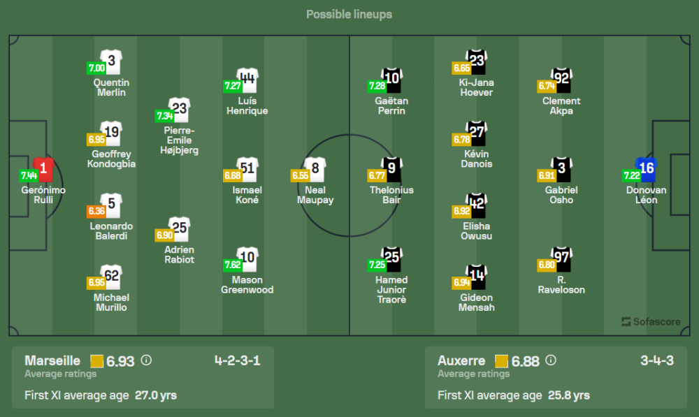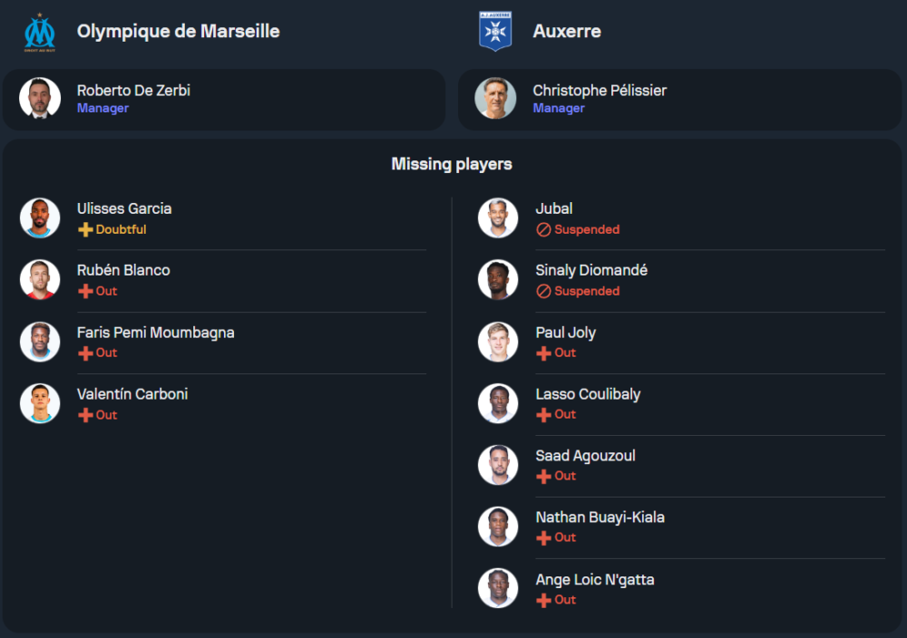 ทีมเจ้าบ้าน มาร์กเซย มีข่าวดีเมื่อ อามีน อาริต พ้นโทษแบนกลับมาช่วยทีมได้อีกครั้ง แต่พวกเขาจะขาด เดเร็ก คอร์เนลิอุส ที่บาดเจ็บจากเกมล่าสุดกับน็องต์ รวมถึง อูลิเสส การ์เซีย ที่ยังอยู่ในลิสต์บาดเจ็บ การจัดทัพครั้งนี้คาดว่าจะมาในระบบ 4-2-3-1 โดยมี เมสัน กรีนวู้ด ที่ฟอร์มร้อนแรง ยิงไปแล้ว 7 ประตูจาก 10 นัด ลงเป็นตัวหลักในแนวรุก ร่วมกับ อามีน อาริต และ หลุยส์ เอ็นริเก้ ที่พร้อมทำเกมสนับสนุน เนอัล โมเปย์ กองหน้าตัวเป้า