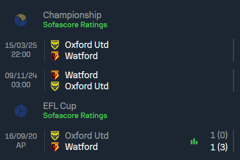 ย้อนกลับไปในลีก คัพ ปี 2020 ทั้งสองทีมเคยพบกันมาแล้วและจบลงด้วยการเสมอกัน 1-1 ซึ่งแสดงให้เห็นว่าความสูสีของคู่นี้ยังคงอยู่ แม้ว่าในช่วงหลังวัตฟอร์ดจะเป็นทีมที่มีขุมกำลังและประสบการณ์เหนือกว่าเล็กน้อย แต่ทางฝั่ง อ็อกซ์ฟอร์ด ยูไนเต็ด ก็ไม่ได้ยอมง่าย ๆ โดยเฉพาะเมื่อเจอกันในบอลถ้วย เกมนี้จึงถือเป็นการวัดฝีเท้ากันอีกครั้งในเวทีที่แตกต่างออกไป
