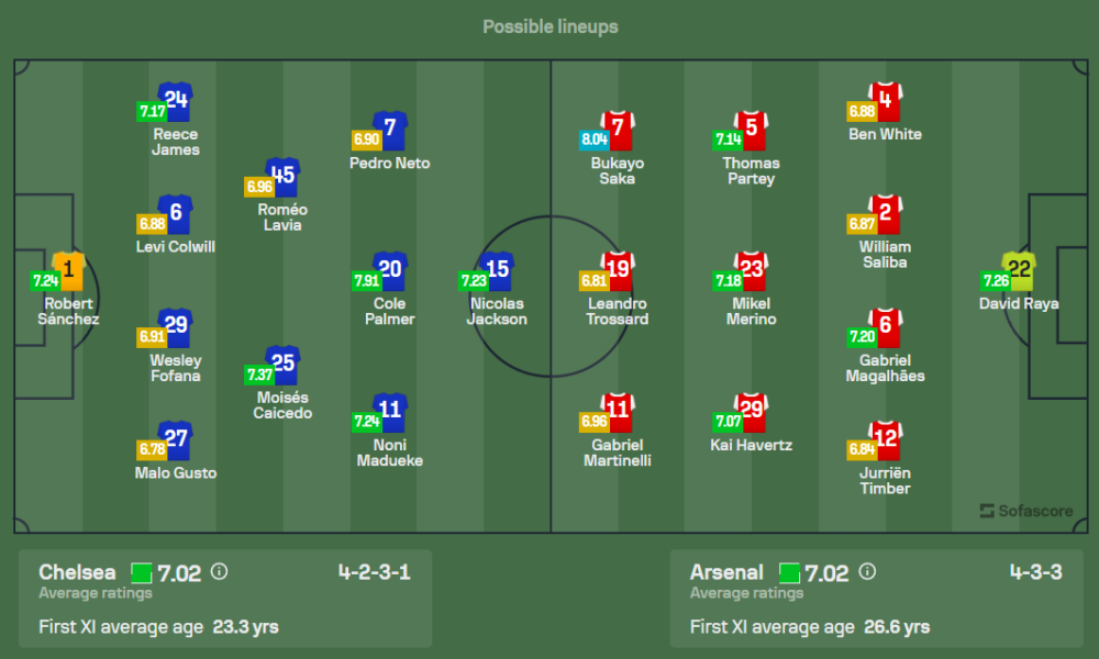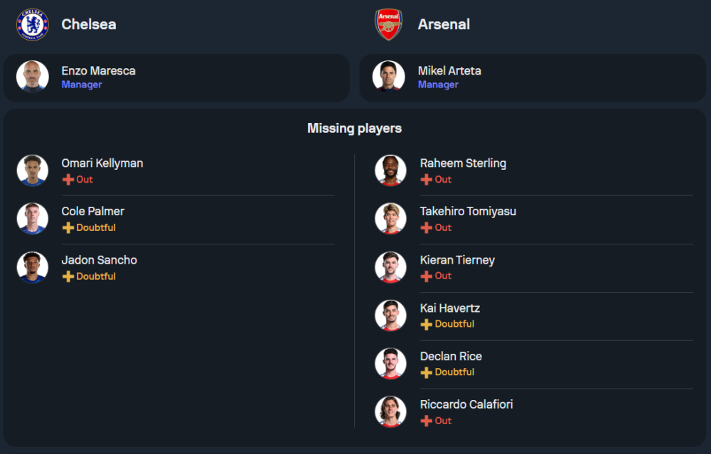 เชลซีภายใต้การคุมทีมของ เอ็นโซ่ มาเรสก้า ยังคงต้องเช็คความฟิตของ โคล พาลเมอร์ ที่เจ็บจากการโดนเข้าสกัดในเกมเสมอแมนเชสเตอร์ ยูไนเต็ด คาดว่าจะหายทันลงสนาม ด้าน เจดอน ซานโช่ กลับมาร่วมทีมหลังพักจากอาการป่วย ในแนวรุก เชลซีจะมีตัวเก่งอย่าง โนนี่ มาดูเอเก้ และ เปโดร เนโต้ สนับสนุน นิโกลัส แจ็คสัน ในการทำประตู ขณะที่แดนกลางจะเป็นหน้าที่ของ มอยเซส ไกเซโด้ และ โรเมโอ ลาเวีย คอยตัดเกมและเสริมการบุก ระบบที่เชลซีเลือกใช้คือ 4-2-3-1 ที่เน้นการสร้างเกมรุกจากด้านข้าง