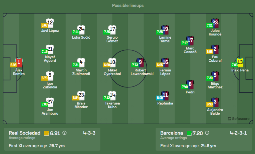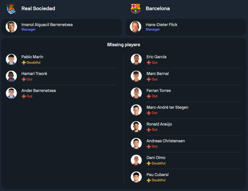 ฮันซี่ ฟลิค ยังคงประสบปัญหาผู้เล่นบาดเจ็บเช่นกัน โดยตัวหลักที่ยังลงสนามไม่ได้รวมถึง เอริก การ์เซีย, โรนัลด์ อาเราโฮ, อันเดรียส คริสเตนเซ่น และ มาร์ค-อันเดร แทร์ ชเตเก้น แต่ฟลิคยังมีแผนปรับผู้เล่นเล็กน้อยจากเกมบุกถล่มเชอร์เวน่า ซเวซด้า 5-2 แนวรุกนำโดย ราฟินญ่า ที่จะคอยสร้างโอกาสและ อเลฆานโดร บัลเด้ ในตำแหน่งแบ็กซ้าย การบุกเป็นหน้าที่ของ ลามีน ยามาล และดานี่ โอลโม่ เพื่อส่งบอลไปให้ โรเบิร์ต เลวานดอฟสกี้ จอมถล่มประตูที่รั้งตำแหน่งดาวซัลโวของลีก บาร์เซโลน่าจะมาในระบบ 4-2-3-1 โดยวางแผนเพื่อเก็บสามแต้มกลับบ้าน