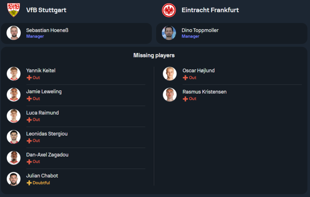 ดิโน่ ท็อปป์เมิลเลอร์ เฮดโค้ชของไอน์ทรัค แฟร้งค์เฟิร์ต มีข่าวดีที่ อาร์ตูร์ ธีอาเทอ จะกลับมาลงสนามได้หลังพ้นโทษแบน แต่ยังคงขาด ราสมุส คริสเตนเซ่น และ ออสการ์ ฮอยลุนด์ ที่ยังไม่หายจากอาการบาดเจ็บ คาดว่าท็อปป์เมิลเลอร์จะจัดทีมในระบบ 4-4-2 เช่นกัน โดยมีคู่กองหน้า โอมาร์ มาร์มูช และ อูโก้ เอคิติเก้ คอยทำเกมรุกเพื่อพังตาข่ายเจ้าถิ่น