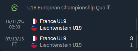 ย้อนกลับไปที่การเจอกันสองครั้งก่อนหน้านี้ ผลการแข่งขันออกมาเป็น ฝรั่งเศส ยู-19 เอาชนะได้ทั้งสองครั้ง โดยในปี 2014 ทีมตราไก่ถล่มชนะไปถึง 6-0 และในปี 2015 ก็ยังคงเหนือกว่าด้วยการเอาชนะ ลิกเทนสไตน์ ยู-19 ไปด้วยสกอร์ 3-1 สถิติเหล่านี้แสดงให้เห็นถึงความแตกต่างของระดับฝีเท้าและความแข็งแกร่งที่เหนือกว่าอย่างชัดเจน