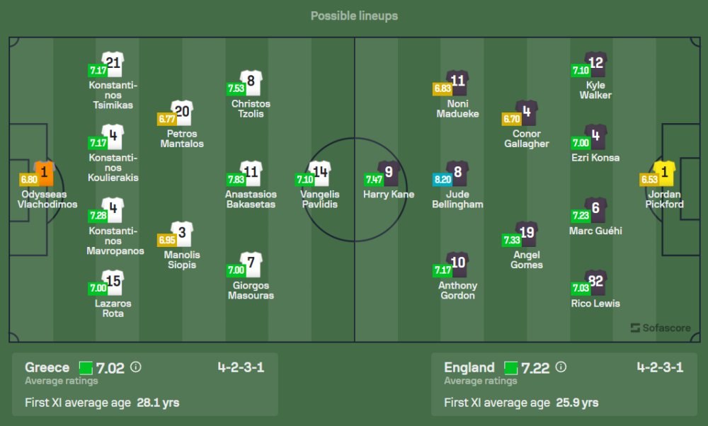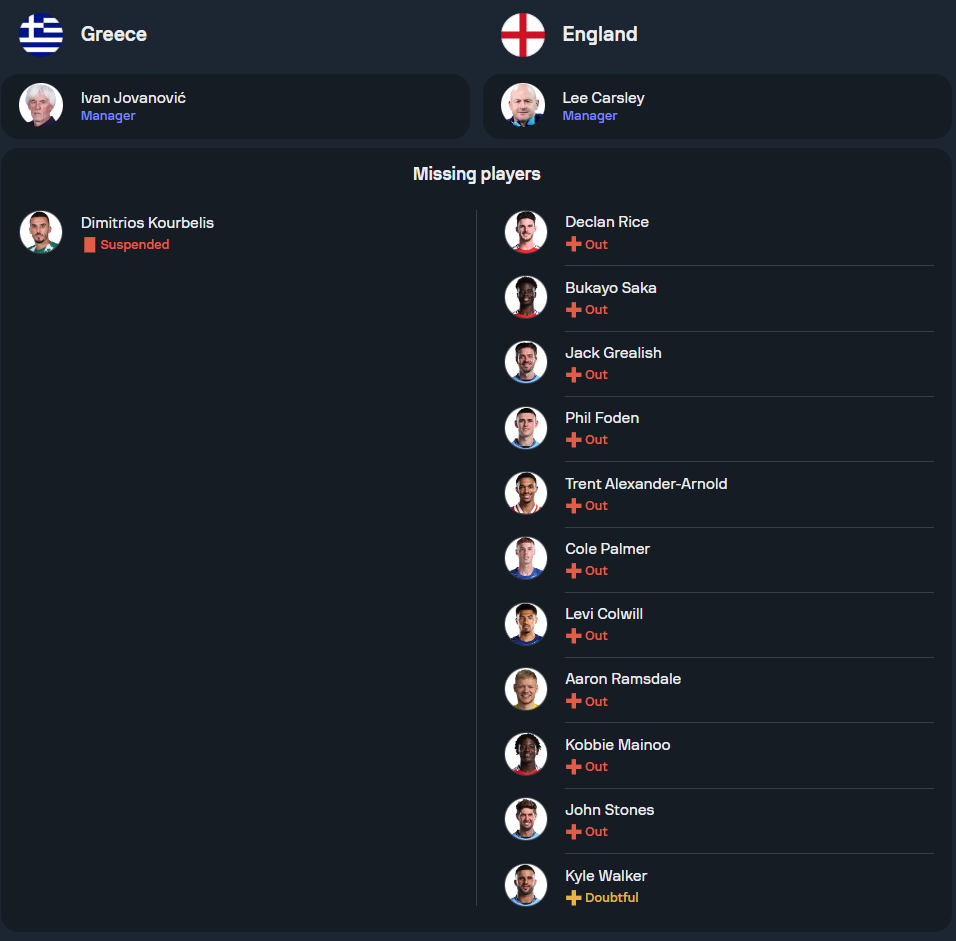 ทัพสิงโตคำรามนำโดยโค้ชชั่วคราว ลี คาร์สลี่ย์ โค้ชชาวไอริช เจอสถานการณ์หนักเมื่อผู้เล่นตัวหลักบาดเจ็บและถอนตัวไปถึง 8 คน ทั้ง บูคาโย่ ซาก้า, เดแคลน ไรซ์, ฟิล โฟเด้น, และ แจ็ค กรีลิช จึงต้องเรียกนักเตะสำรองอย่าง มอร์แกน โรเจอร์ส และ เทย์เลอร์ ฮาร์วู้ด-เบลลิส เข้ามาเสริมทัพ ขณะที่เกมรุกยังคงมี แฮร์รี่ เคน กัปตันทีมลงล่าตาข่าย ร่วมด้วย จู๊ด เบลลิงแฮม, โนนี่ มาดูเอเก้, และ แอนโธนี่ กอร์ดอน ช่วยปั้นเกมบุกในระบบ 4-2-3-1