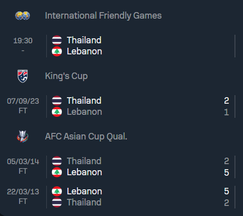 จากการพบกันในอดีต สถิติชี้ให้เห็นว่า ไทย และ เลบานอน ต่างเคยชนะกันมาคนละ 2 ครั้ง โดยล่าสุดเมื่อวันที่ 7 กันยายน 2566 ทีมชาติไทยเอาชนะเลบานอนไปได้ด้วยสกอร์ 2-1 ขณะที่การเจอกันก่อนหน้านั้นในปี 2014 เลบานอนเคยบุกถล่มไทยไปถึง 5-2 ทำให้สถิติการพบกันยังสูสีกันอยู่ แต่เมื่อพิจารณาฟอร์มปัจจุบัน ทีมชาติไทยดูจะมีความมั่นใจมากกว่า