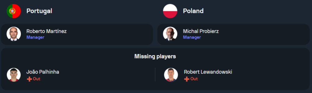 ทีมเจ้าบ้าน โปรตุเกส นำโดยกุนซือ โรแบร์โต้ มาร์ติเนซ ต้องเจอกับปัญหานักเตะบาดเจ็บหลายคน ได้แก่ รูเบน ดิอ๊าซ กองหลังจากแมนเชสเตอร์ ซิตี้, เปโดร กอนคัลเวส มิดฟิลด์จากสปอร์ติ้ง ลิสบอน และ ดิโอโก้ โชต้า ตัวรุกจากลิเวอร์พูล ทั้งหมดไม่พร้อมลงสนามในเกมนี้ อย่างไรก็ตาม ทีมจะยังคงใช้ระบบ 4-3-3 โดยสามประสานเกมรุกจะเป็น เปโดร เนโต้, คริสเตียโน่ โรนัลโด้ และ ราฟาเอล เลเอา ที่จะเป็นตัวหลักในการล่าประตู