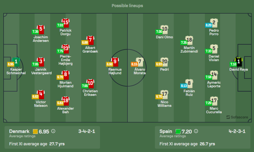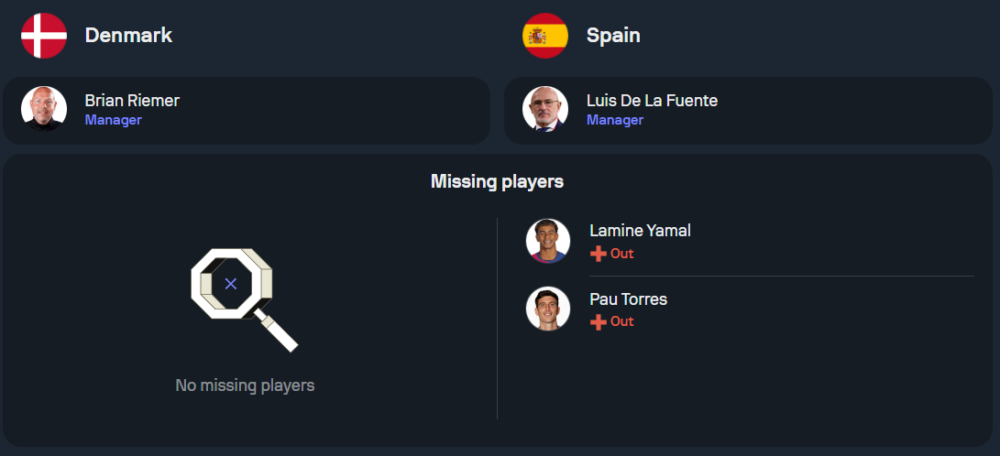 ทางด้านทีมเยือน สเปน ที่นำทัพโดย หลุยส์ เด ลา ฟวนเต้ ก็ต้องเจอกับปัญหานักเตะบาดเจ็บเช่นกัน พวกเขาจะไม่มี เปา ตอร์เรส, ดานี่ การ์บาฆัล, โรดรี้ และ ลามีน ยามาล ที่ต้องถอนตัวออกจากทีมเนื่องจากอาการบาดเจ็บ แต่ผู้เล่นคนอื่น ๆ ยังคงฟิตเต็มที่ โดยสเปนจะมาในระบบ 4-3-3 ที่เน้นเกมรุกสุดกำลัง สามประสานแดนหน้าจะประกอบไปด้วย ดานี่ โอลโม่, มิเคล โอยาร์ซาบัล, และ นิโก้ วิลเลี่ยมส์ ซึ่งเป็นตัวอันตรายที่ต้องจับตามอง