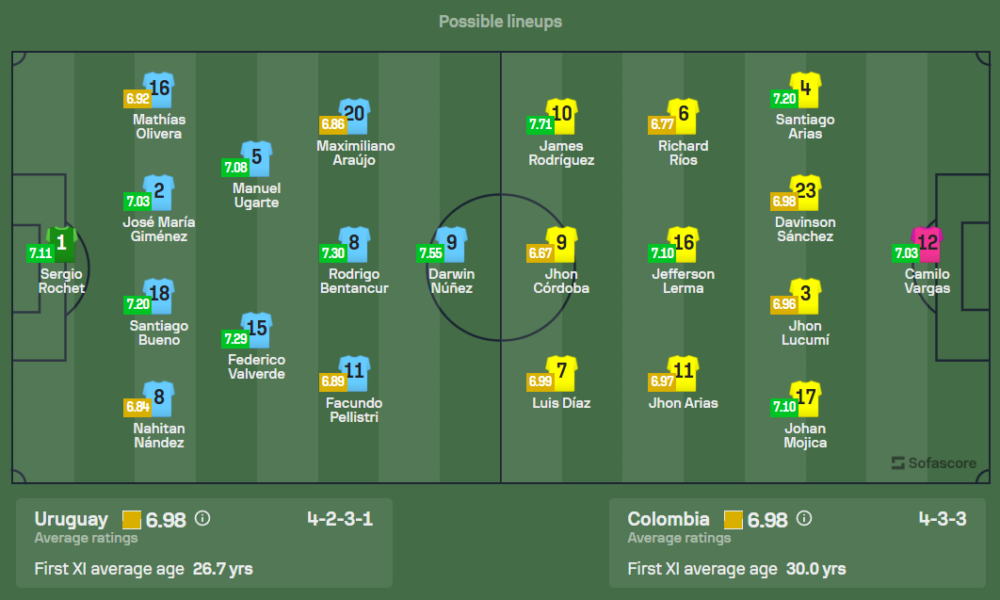 ด้านทีมเยือน โคลัมเบีย ภายใต้การคุมทีมของ เนสตอร์ ลอเรนโซ่ ต้องเจอกับปัญหานักเตะบาดเจ็บหลายคน โดยจะขาดผู้เล่นหลักอย่าง หลุยส์ ซินิสเตรา, ฮวน กาบาล, เจฟเฟอร์สัน เลอร์มา, และ ยาเซอร์ อัสปริยา ซึ่งต้องถอนตัวออกไปทั้งหมด อย่างไรก็ตาม โคลัมเบียยังคงแข็งแกร่งและคาดว่าจะมาในระบบ 4-2-3-1 โดยใช้สามประสานแดนกลางคือ หลุยส์ ดิอาซ, ฮาเมส โรดริเกซ, และ จอน อาริยาส ในการสร้างเกมรุก สนับสนุนกองหน้าตัวเป้าอย่าง จอห์น ดูรัน ที่จะคอยล่าประตู