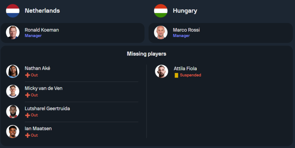 เนเธอร์แลนด์ ภายใต้การคุมทีมของ โรนัลด์ คูมัน ต้องเจอกับปัญหานักเตะบาดเจ็บหลายราย โดยเฉพาะแนวรับ ทั้ง นาธาน อาเก้, มิคกี้ ฟาน เดอ เฟ่น, ลุตชาเรล เกียร์ทราวด้า, และ เอียน มาตเซ่น ที่พลาดการลงสนามในเกมนี้ แต่ข่าวดีก็คือการกลับมาของ เจอร์เรียน ทิมเบอร์ ที่หายเจ็บกลับมาสมทบทีม ขณะเดียวกันต้องรอเช็กฟิต เฟร็งกี้ เดอ ยอง ที่ถูกเปลี่ยนออกในเกมที่บาร์เซโลนาพ่ายต่อเรอัล โซเซียดาดก่อนหน้านี้ คาดว่าเขาน่าจะฟิตพอที่จะลงสนามในคู่มิดฟิลด์กับ ไรอัน กราเฟนแบร์ค และมี ทีจานี่ ไรน์เดอร์ส ขยับขึ้นสูงช่วยสร้างสรรค์เกมรุก ระบบที่คาดว่าจะใช้คือ 4-2-3-1 โดยมีสามประสานเกมรุก ทีจานี่ ไรน์เดอร์ส, ดอนเยลล์ มาเล่น, และ โกดี้ คักโป ส่วนหน้าเป้าเป็นหน้าที่ของ เวาต์ เว็กฮอร์สต์ ที่พร้อมล่าตาข่าย
