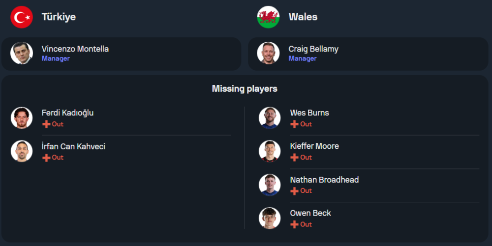 ทางด้านทีมเยือน เวลส์ ที่นำทีมโดย เคร็ก เบลลามี่ ก็มีปัญหาผู้เล่นบาดเจ็บหลายรายเช่นกัน ทั้ง คีฟเฟอร์ มัวร์, นาธาน โบรดเฮ้ด, เวสลี่ย์ เบิร์น, อารอน แรมซี่ย์ และ อีธาน แอมปาดู ซึ่งจะพลาดการลงสนามทั้งหมด คาดว่าเวลส์จะลงเล่นในระบบ 4-2-3-1 เช่นเดียวกัน โดยมี เบรนแน่น จอห์นสัน เป็นกองหน้าตัวเป้าที่จะรับหน้าที่ทำประตูในเกมนี้