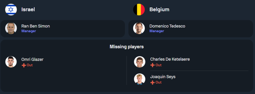 อิสราเอล รั้งอันดับ 4 ของกลุ่ม มีเพียง 1 คะแนนจากการลงเล่น 5 นัด ฟอร์มการเล่นย่ำแย่ ไม่สามารถคว้าชัยชนะได้เลย เสมอ 1 แพ้ 4 นัดล่าสุดยันเสมอ ฝรั่งเศส 0-0 แม้จะได้ผลเสมอ แต่ยังไม่เพียงพอที่จะเรียกความมั่นใจกลับมาได้ ขณะที่ เบลเยียม มีอันดับที่ดีกว่า อยู่ที่ 3 ด้วยคะแนน 4 แต้มจากการลงเล่น 5 นัด แต่ผลงานก็ไม่สู้ดีนัก ชนะเพียง 1 นัด เสมอ 1 และแพ้ไปถึง 3 นัด ฟอร์มล่าสุดแพ้ อิตาลี 0-1 อย่างน่าผิดหวัง