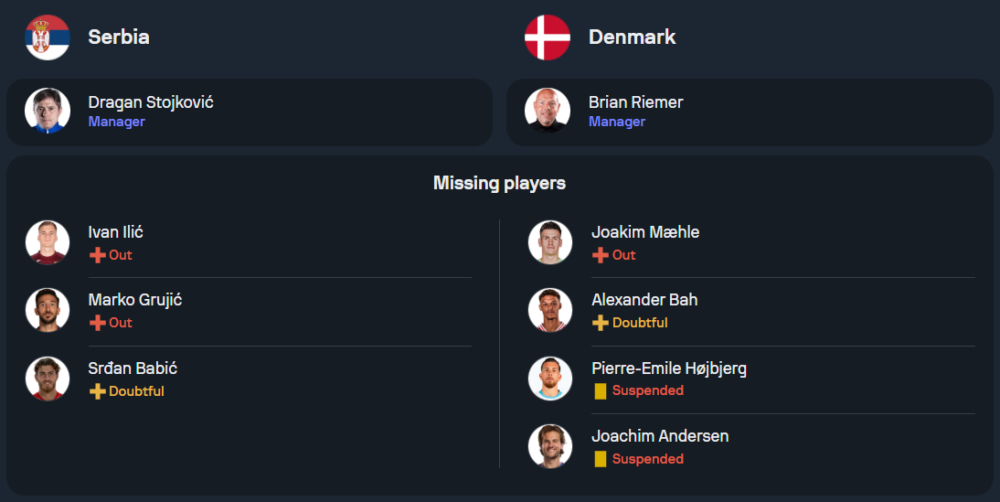สำหรับฝั่งเจ้าบ้าน เซอร์เบีย ภายใต้การนำของ ดรากัน สตอยโควิช ต้องเผชิญกับปัญหาผู้เล่นบาดเจ็บ โดย วานย่า มิลินโควิช-ซาวิช และ อีวาน อิลิช จะพลาดลงสนาม ขณะที่ เซอร์เก มิลินโควิช-ซาวิช ถูกตัดออกจากทีมด้วยเหตุผลด้านแท็กติก คาดว่าทีมจะใช้ เนมานย่า กูเดลี และ เนมานย่า มักซิโมวิช คุมแดนกลาง โดยมีกองหน้าคู่ ดูชาน วลาโฮวิช และ อเล็กซานดาร์ มิโตรวิช เป็นตัวหลักในระบบ 3-4-1-2 ซึ่งหวังจะใช้ความแข็งแกร่งของแนวรุกเพื่อกดดันทีมเยือน
