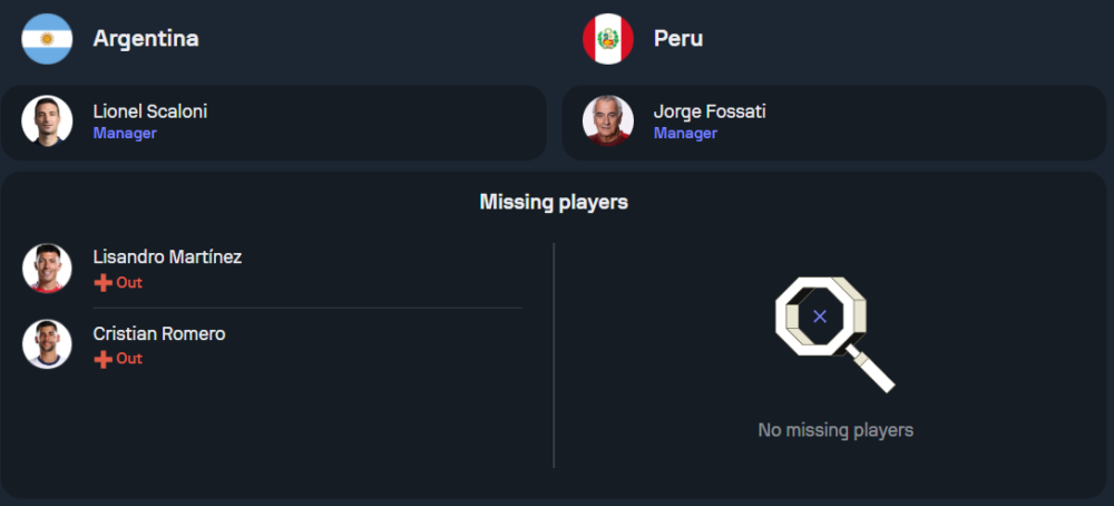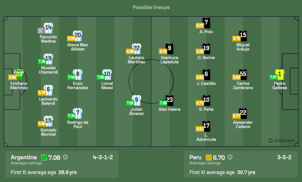 ทีมเจ้าบ้าน อาร์เจนตินา ภายใต้การคุมทีมของ ลิโอเนล สกาโลนี ต้องเจอกับปัญหาเล็กน้อย เนื่องจาก คริสเตียน โรเมโร่ กองหลังตัวหลักจากสเปอร์สบาดเจ็บและไม่พร้อมลงสนาม แต่การเตรียมทีมครั้งนี้ก็ยังมีขุมกำลังที่แข็งแกร่ง โดยคาดว่า เลโอนาร์โด้ บาเลร์ดี้ จากมาร์กเซยจะได้ลงทำหน้าที่แทน ส่วนแนวรุกจะใช้ ลีโอเนล เมสซี่, ฆูเลี่ยน อัลวาเรซ และ เลาตาโร่ มาร์ติเนซ ที่ทำผลงานยอดเยี่ยมในเกมที่ผ่านมา ทีมจะมาในระบบ 4-2-3-1 ที่เน้นการโจมตีและการครองบอลเป็นหลัก