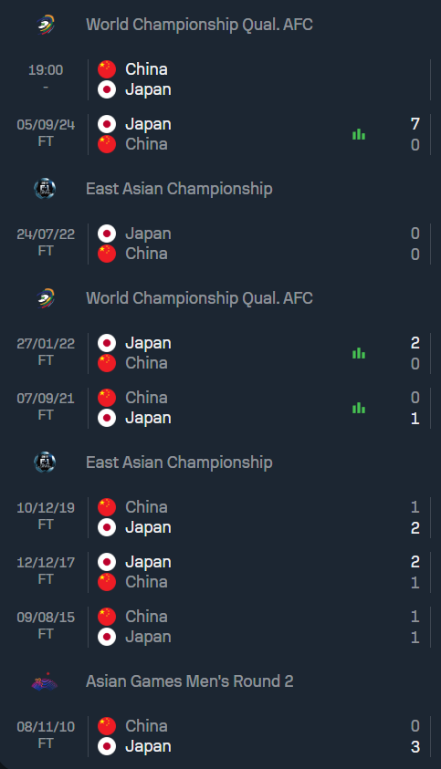 การเจอกันของ จีน และ ญี่ปุ่น นั้นมีประวัติการแข่งขันที่ดุเดือด โดยในช่วงหลัง ญี่ปุ่น มีสถิติที่ดีกว่าอย่างชัดเจน ชนะไปถึง 6 จาก 10 นัดล่าสุด ครั้งสุดท้ายที่ทั้งสองทีมเจอกันเมื่อวันที่ 5 กันยายน 2567 ญี่ปุ่นโชว์ฟอร์มโหด ถล่มเอาชนะจีนไป 7-0 ทำให้เกมนี้ถือเป็นความท้าทายสำคัญสำหรับเจ้าบ้านที่จะต้องล้างตาและเรียกศักดิ์ศรีคืน ขณะที่เกมก่อนหน้าใน อีสต์ เอเชี่ยน แชมเปี้ยนชิพ ทั้งสองทีมเคยเสมอกันไป 0-0 ถือเป็นอีกหนึ่ง ทีเด็ดบอล ที่ต้องจับตามอง เพราะไม่แน่ว่าผลการแข่งขันในครั้งนี้อาจหักมุมได้อีกครั้ง