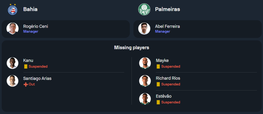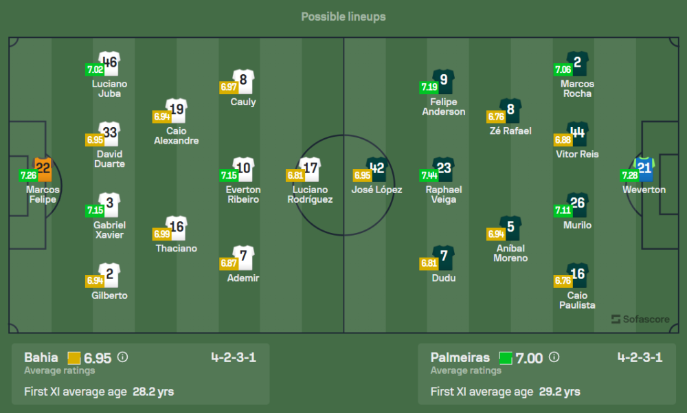 บาเฮียเพิ่งบุกพ่ายยูเวนตูเด้ 1-2 ในเกมลีกนัดล่าสุด สถานการณ์ของทีมยังคงวิกฤต โดยยังต้องขาดผู้เล่นตัวหลักหลายคนจากโทษแบนและอาการบาดเจ็บ ทั้งฌอน ลูคัส, กาเบรียล ซาเวียร์ และคานู รวมถึงยาโก้ อามารัล, เรเซนเด้ และบิเอล คาดว่าจะใช้ระบบ 4-3-3 โดยมีสามประสานแดนหน้าอย่างอเดเมียร์ ดา ซิลวา, ลูเซียโน่ โรดริเกวซ และเคาลี่ โอลิไวร่า ซูซ่า หวังช่วยกันทำประตู
