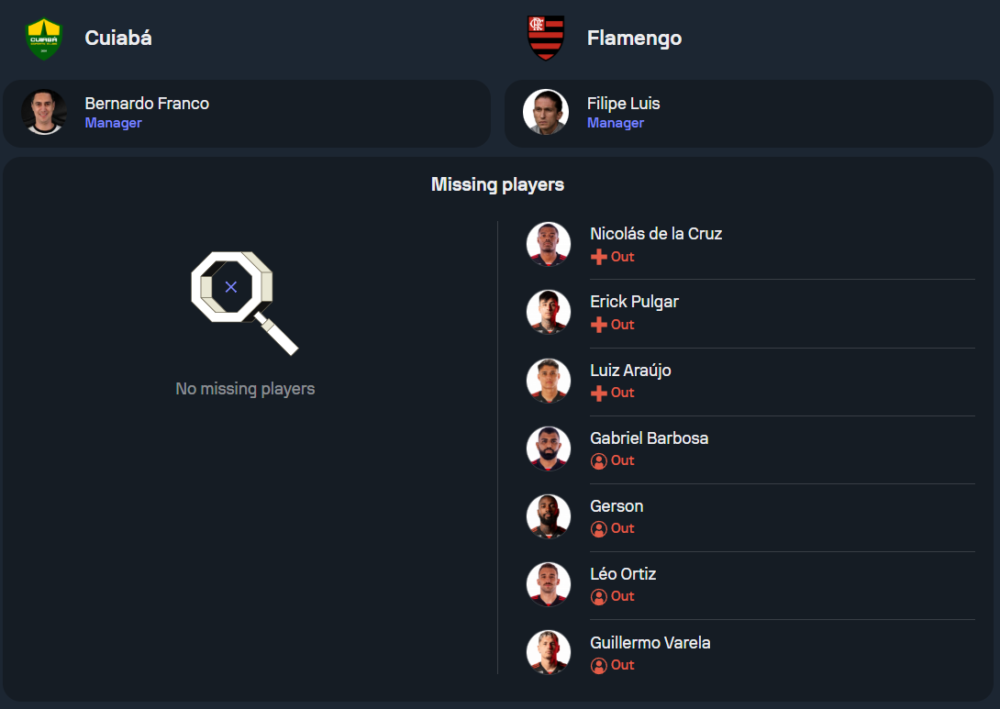 ด้านฟลาเมงโก เพิ่งเสมอแอตเลติโก มิไนโร่ 0-0 ในเกมกลางสัปดาห์ที่ผ่านมา การจัดตัวครั้งนี้มีความท้าทายมาก เนื่องจากพวกเขาขาดผู้เล่นหลักหลายราย ทั้งจากการบาดเจ็บและโทษแบน เช่น เปโดร กีลแญร์เม่ และอัลลาน โรดริเกวส อย่างไรก็ตาม ทีมยังมี มิชาเอล ริชาร์ด คอยล่าตาข่ายในระบบ 3-4-2-1