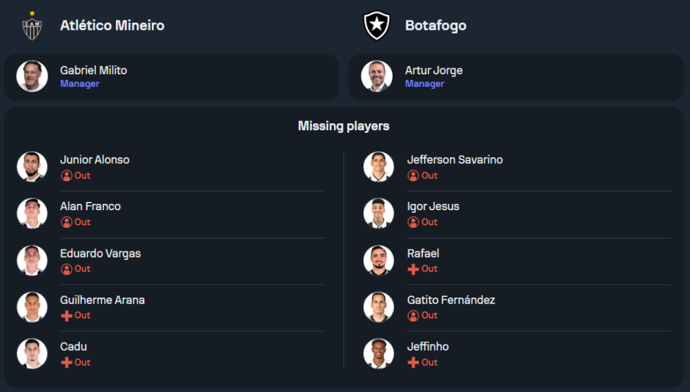 ด้านโบตาโฟโก้เพิ่งเสมอกับ คูยาบา 0-0 ในเกมล่าสุด สภาพทีมค่อนข้างสมบูรณ์ ไม่มีผู้เล่นตัวหลักได้รับบาดเจ็บเพิ่มเติม แต่ยังคงขาด ปาโบล นาสซิเมนโต้ และ มาเธอุส นาสซิเมนโต้ ที่ยังไม่ฟื้นตัว คาดว่าพวกเขาจะใช้ระบบ 4-2-3-1 โดยมี อิกอร์ เฮซุส ยืนหน้าเป้าล่าตาข่าย และ เจฟเฟอร์ซอน ซาวาริโน่ ทำหน้าที่สร้างสรรค์เกมอยู่ด้านหลัง