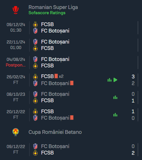 ชี้ให้เห็นถึงความเหนือกว่าของ สเตอัว บูคาเรสต์ ที่สามารถคว้าชัยได้ถึง 8 ครั้งจาก 10 นัดหลังสุด โดยครั้งล่าสุดเมื่อเดือนกุมภาพันธ์ปีนี้ สเตอัวบูคาเรสต์เป็นฝ่ายเฉือนชนะ 3-2 ขณะที่ โบโตซานี่ ยังต้องดิ้นรนอย่างหนักเพื่อหาชัยชนะให้ได้ในเกมนี้ ซึ่งข้อมูลจาก ทีเด็ดบอล บ่งบอกว่าเกมนี้น่าจะเป็นอีกครั้งที่ทีมเยือนมีโอกาสเหนือกว่า
