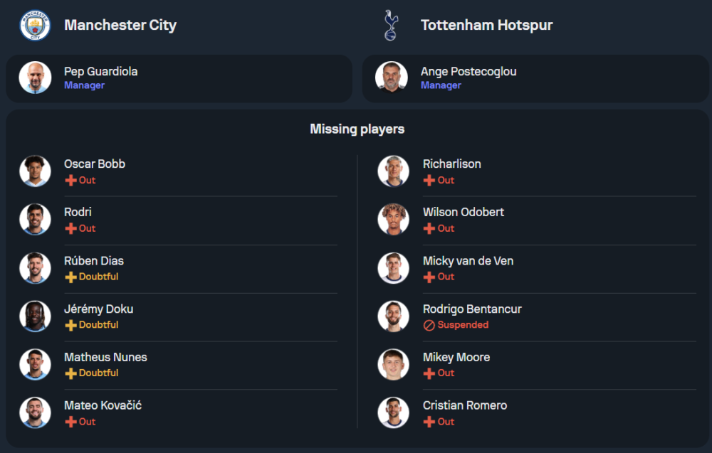 กุนซือ เป๊ป กวาร์ดิโอล่า ยังคงต้องเจอปัญหาเรื่องอาการบาดเจ็บของนักเตะหลายราย ทั้ง ออสการ์ บ็อบบ์, โรดรี้, หลุยส์ ดิอาซ และ มัตเตโอ โควาซิช ที่หมดสิทธิ์ลงสนามในเกมนี้ นอกจากนี้ยังต้องรอเช็คความฟิตของนักเตะสำคัญอย่าง นาธาน อาเก้, จอห์น สโตนส์ และ แจ็ค กรีลิช แต่แนวรุกตัวเก่งอย่าง เควิน เดอ บรอยน์, แบร์นาโด้ ซิลวา และ เออร์ลิ่ง ฮาแลนด์ พร้อมลงล่าตาข่ายในระบบ 4-2-3-1