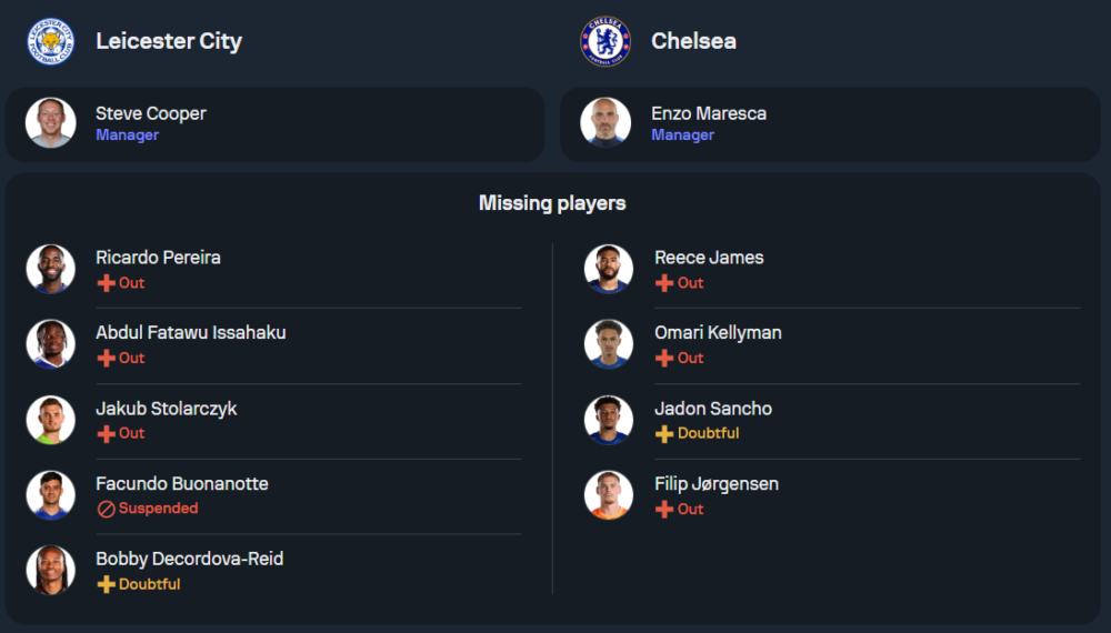 ทีมเยือนภายใต้การคุมทีมของ เอ็นโซ่ มาเรสก้า ต้องรอเช็คความฟิตของนักเตะสำคัญอย่าง เจดอน ซานโช่, เวสลีย์ โฟฟาน่า, มาโล กุสโต้ และ โรเมโอ ลาเวีย แต่ผู้เล่นตัวหลักที่เหลือยังพร้อมลงสนามครบครัน โดยเฉพาะแนวรุกที่มี โคล พาล์มเมอร์, โนนิ มาดูเอเก้ และ เปโดร เนโต้ ในระบบ 4-2-3-1