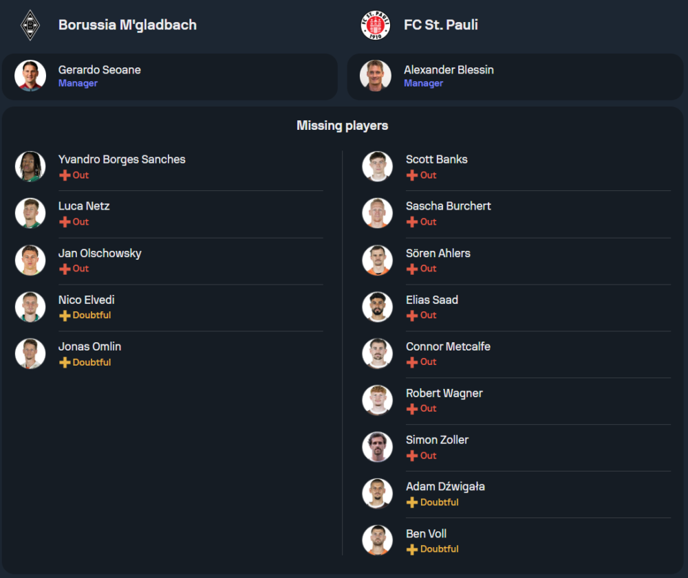 ซังต์ เพาลี: ทีมเยือนยังคงเจอปัญหาเรื่องผู้เล่นบาดเจ็บอย่างต่อเนื่อง โดยเฉพาะในแดนกลางที่ขาด โรเบิร์ต ว้ากเนอร์ และ คอนเนอร์ เม็ตคัลเฟ่ รวมถึงกองหน้าอย่าง เอเลียส ซาอัด และ สกอตต์ แบงค์ ที่ยังไม่พร้อม เกมนี้ โค้ชของทีมคาดว่าจะส่งทีมในระบบ 3-4-3 โดยมี โอลาดาโป้ อาโฟลายาน, โยฮันเนส เอ้กสไตน์ และ มอร์แกน กีลาโวกี เป็นสามประสานในแดนหน้า