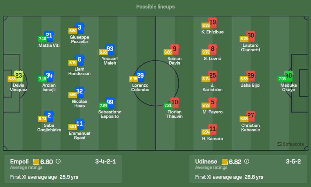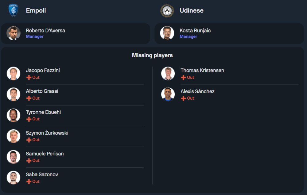 อูดิเนเซ่ ภายใต้การคุมทีมของ คอสต้า รุนยาอิช สถานการณ์ยังไม่น่าไว้วางใจ ผู้เล่นตัวหลักหลายรายยังเจ็บ เช่น โทมัส คริสเตนเซ่น และ อเล็กซิส ซานเชซ แต่ข่าวดีคือการพ้นโทษแบนของ อิซัค ตูเร่ แนวรับที่พร้อมกลับมาช่วยทีมในระบบ 3-5-2 โดยกองหน้าคู่ยังคงใช้ คีแนน เดวิส และ ฟลอร็องต์ โตแว็ง ในการล่าตาข่าย
