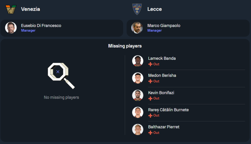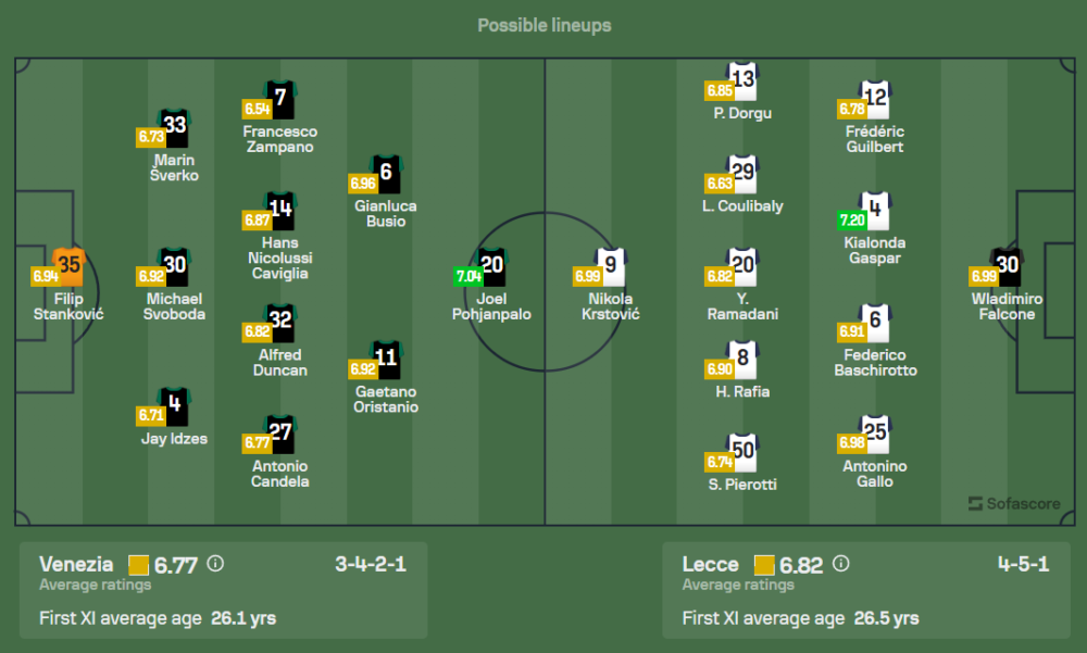 เอซี เวนิช ภายใต้การนำของ ยูเซบิโอ ดิ ฟรานเชสโก้ ไม่มีปัญหาเรื่องผู้เล่นบาดเจ็บหรือติดโทษแบน ทำให้สามารถจัดทีมชุดใหญ่ได้เต็มสูบ เกมนี้คาดว่าจะมาในระบบ 3-4-2-1 โดยวาง โยเอล โปห์ยานปาโล เป็นกองหน้าตัวเป้าเพื่อไล่ล่าสกอร์