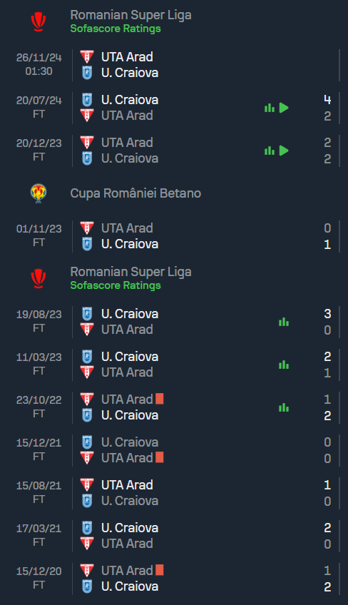 ของทั้งสองทีมที่ผ่านมา แสดงให้เห็นถึงความได้เปรียบของ ซีเอส คราอิโอว่า อย่างชัดเจน โดย 10 นัดหลังสุด พวกเขาเก็บชัยชนะได้ถึง 7 นัด เสมอ 2 นัด และแพ้ให้ ยูทีเอ อารัด เพียงครั้งเดียวเท่านั้น เกมล่าสุด ซีเอส คราอิโอว่า เปิดบ้านเอาชนะไป 4-2 สถิติเหล่านี้ทำให้เกมนี้แฟนบอลที่ติดตาม ทีเด็ดบอล มองว่าทีมเยือนยังคงมีโอกาสสูงที่จะเก็บแต้มกลับไปได้