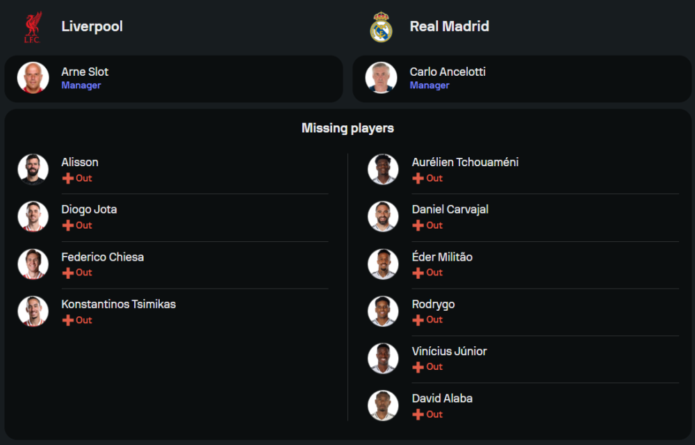 คาร์โล อันเชลอตติ ยังคงเจอปัญหาในทีมเช่นกัน ผู้เล่นตัวหลักอย่าง โรดรีโก้, ดานี่ การ์บาฆาล, ดาวิด อลาบา, เอแดร์ มิลิเตา และ วินิซิอุส จูเนียร์ ยังไม่พร้อมลงสนาม เกมนี้คาดว่าจะมาในระบบ 4-3-3 โดยใช้ บราฮิม ดิอาส, เอ็นดริก และ คิลิยัน เอ็มบัปเป้ เป็นสามประสานในเกมรุกเพื่อล่าตาข่าย