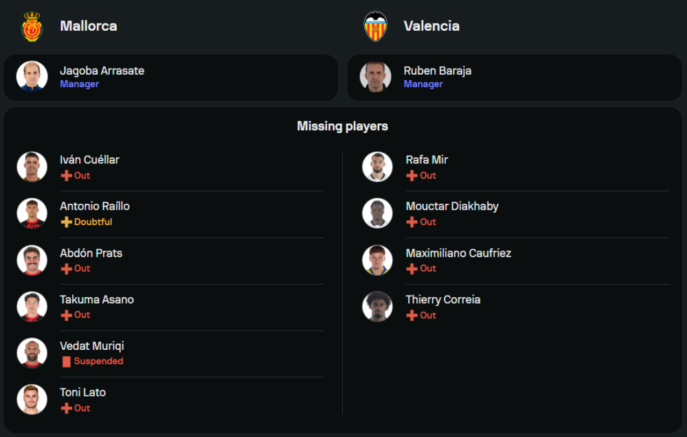 มายอร์ก้าของกุนซือ ฆาโกบา อาร์ราซาเต้ มีความกดดันอยู่บ้าง แต่การที่พวกเขาปลดล็อกชัยชนะในเกมล่าสุดถือเป็นกำลังใจสำคัญ อย่างไรก็ตาม ทีมยังต้องเจอปัญหาเมื่อ เวดัต มูริกี้ หัวหอกตัวเก่งโดนใบแดงในเกมก่อน ทำให้ ไคล์ ลาริน ต้องเร่งความฟิตเพื่อประจำการในแนวรุก ร่วมกับ ดานี่ โรดริเกวซ ที่เป็นตัวความหวังในแดนหน้า