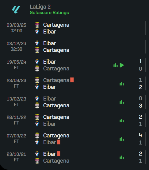 การเจอกันระหว่าง เออิบาร์ และ เอฟซี คาร์ทาเกน่า ในช่วงหลังเต็มไปด้วยความสูสี โดยเกมล่าสุด เออิบาร์ เปิดบ้านเฉือนชนะไป 1-0 นอกจากนี้ เออิบาร์ ยังสามารถเก็บชัยชนะได้ 2 เกมติดต่อกันเมื่อเจอกับคาร์ทาเกน่า สถิติรวมชนะ 3 แพ้ 3 ถือว่าสูสีกันอย่างมาก เกมนี้คาดว่าจะเป็นอีกหนึ่งแมตช์ที่เต็มไปด้วยความดุเดือดและ ทีเด็ดบอล ต้องจับตาฟอร์มเจ้าบ้านที่ได้เปรียบจากสนามเหย้า