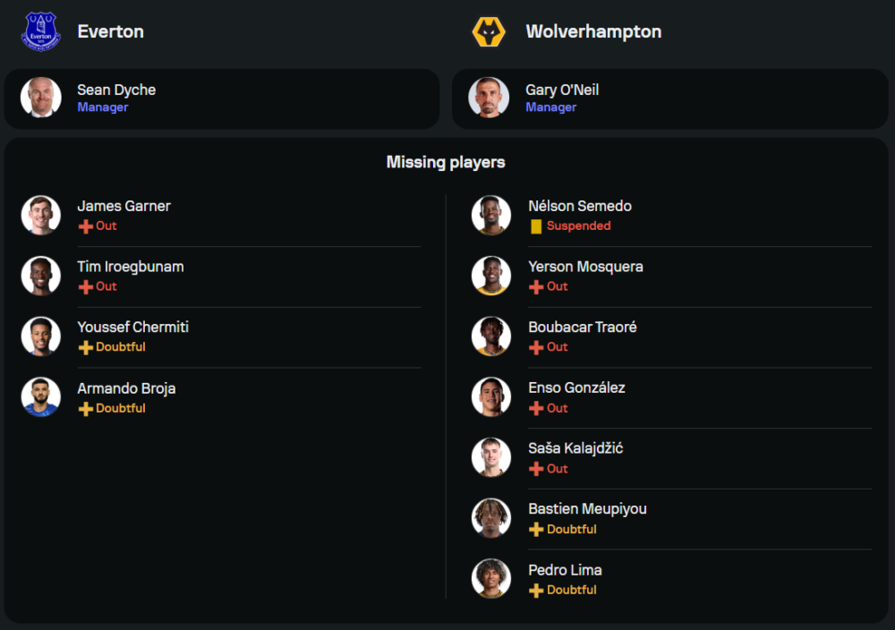 ลูกทีมของ ฌอน ไดช์ กำลังอยู่ในช่วงขาลงอย่างหนัก หลังจากบุกไปโดนแมนฯ ยูไนเต็ดถล่มยับ 0-4 ในเกมที่ผ่านมา อีกทั้งปัญหาการทำประตูที่ฝืดเคืองอย่างต่อเนื่องใน 4 เกมหลังยังแก้ไม่ตก ความพร้อมของทีมยังขาดผู้เล่นสำคัญอย่าง เจมส์ การ์เนอร์ และ ทิโมธี่ อิโรจีบูนัม ที่ยังไม่ฟื้นตัว แต่ข่าวดีคือผู้เล่นหลักอย่าง โดมินิก คัลเวิร์ต-เลวิน พร้อมล่าตาข่าย โดยคาดว่าจะมาในระบบ 4-2-3-1 เน้นการครองบอลและสร้างโอกาสจากแดนกลาง
