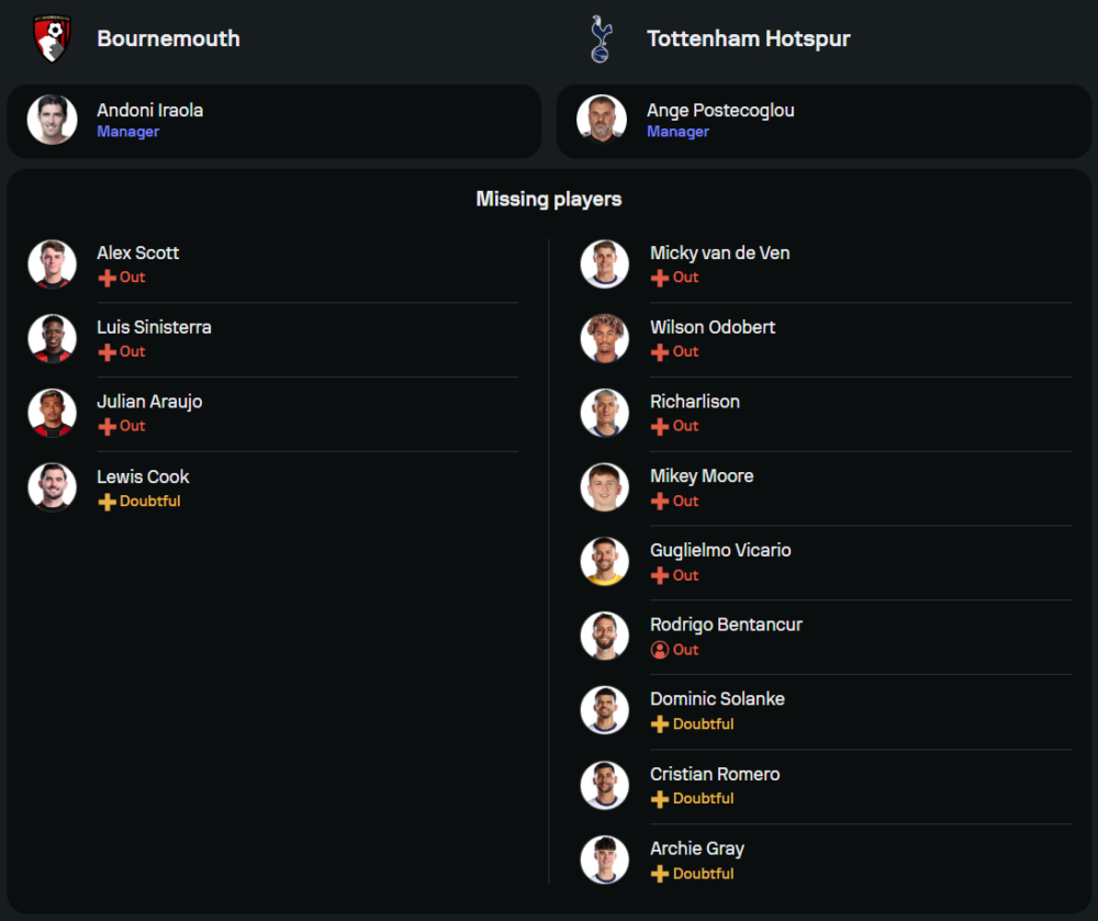 ทีมเยือนแม้จะมีข่าวดีเล็กน้อยจากการกลับมาของ โดมินิก โซลันกี้ แต่ก็ยังคงขาดกำลังหลักหลายคน เช่น คริสเตียน โรเมโร่ และ มิคกี้ ฟาน เดอ เฟ่น ทีมของ แอนจ์ ปอสเตโคกลู จะมาในระบบ 4-3-3 โดยมีตัวรุกอย่าง ซน ฮึง-มิน, เบรนแน่น จอห์นสัน และ โดมินิก โซลันกี้ เป็นสามประสานในแดนหน้า
