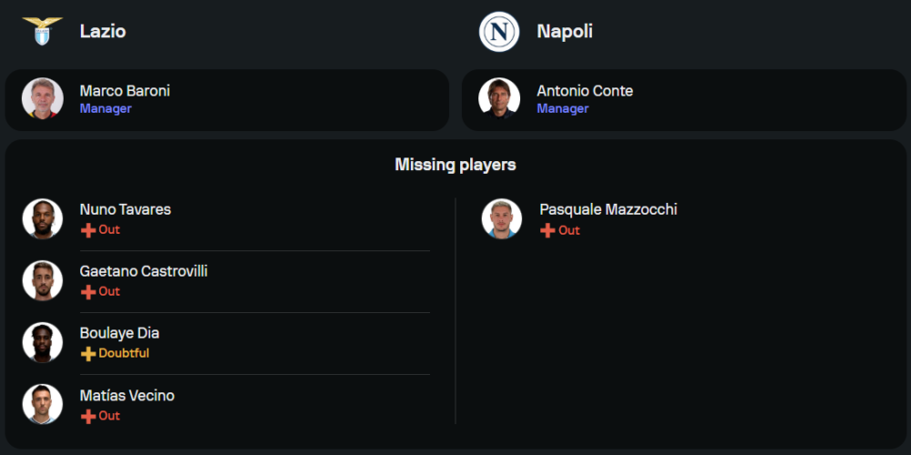 ทีมเยือนนำโดย อันโตนิโอ คอนเต้ ก็เลือกใช้แผนโรเตชั่นเช่นกัน โดยผู้เล่นหลักอย่าง โรเมลู ลูกากู และ ควิชา ควารัตสเคเลีย จะได้พัก ขณะที่ตัวรุกสำรองอย่าง จาโคโม่ ราสปาโดรี่ และ ดาวิด เนเรส พร้อมลงสร้างความแตกต่างในเกมรุก โดยมี โจวานนี่ ซิเมโอเน่ เป็นตัวจบสกอร์