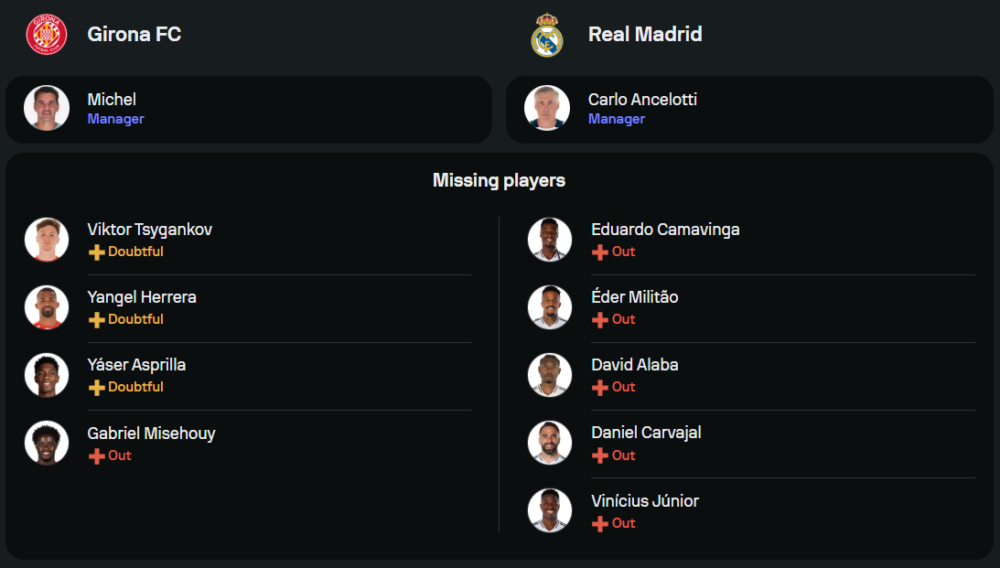 ด้านทีมเยือนของ คาร์โล อันเชล็อตติ ยังคงขาดผู้เล่นสำคัญหลายราย ไม่ว่าจะเป็น วินิซิอุส จูเนียร์, ออเรเลียง ชูอาเมนี่ และ ดานี่ การ์บาฆาล แต่ยังมีตัวเลือกอย่าง โรดริโก้ และ คิเลียน เอ็มบัปเป้ ที่เป็นตัวทีเด็ดในแนวรุก การจัดทัพจะมาในระบบ 4-4-2 โดย ลูก้า โมดริช และ จู๊ด เบลลิ่งแฮม จะเป็นแกนหลักในแดนกลาง
