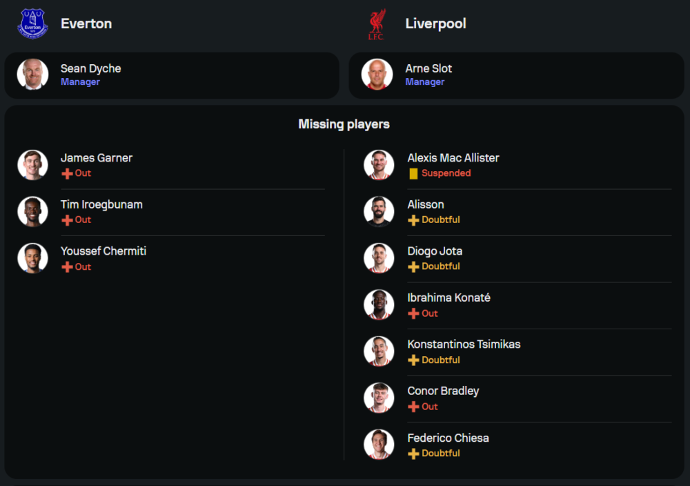 เจ้าบ้าน เอฟเวอร์ตัน ภายใต้การคุมทีมของ ฌอน ไดช์ กลับมาโชว์ฟอร์มได้อย่างน่าประทับใจด้วยการถล่มวูล์ฟส์ 4-0 ในเกมล่าสุด แต่พวกเขายังต้องเจอกับปัญหาในแดนกลาง เนื่องจาก เจมส์ การ์เนอร์ และ ทิโมธี่ อิโรจีบูนัม ยังไม่พร้อมลงสนาม แนวรุกยังต้องพึ่งพา โดมินิก คัลเวิร์ต-เลวิน ที่มี อับดูลาย ดูกูเร่ สนับสนุนจากด้านหลัง ระบบ 4-4-1-1 จะเป็นหัวใจหลักในเกมนี้อีกครั้ง