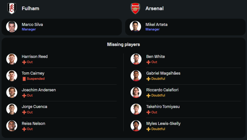 มาร์โก ซิลวา กุนซือฟูแล่ม ต้องเผชิญปัญหาการจัดทัพเมื่อขาดผู้เล่นคนสำคัญอย่าง ทอม แคร์นี่ย์ กัปตันทีมที่ติดโทษแบน และ รีสส์ เนลสัน ที่ไม่สามารถลงสนามได้ตามเงื่อนไขการยืมตัว แต่ข่าวดีคือ ซาช่า อิลิช พร้อมกลับมาช่วยทีม ขณะที่ อเล็กซ์ อิโวบี และ เอมิล สมิธ โรว์ สองแข้งเก่าของอาร์เซนอล จะร่วมกันสร้างสรรค์เกมรุกในระบบ 4-2-3-1 โดยมี ราอูล ฮีเมเนซ รับหน้าที่เป็นหัวหอกตัวเป้า