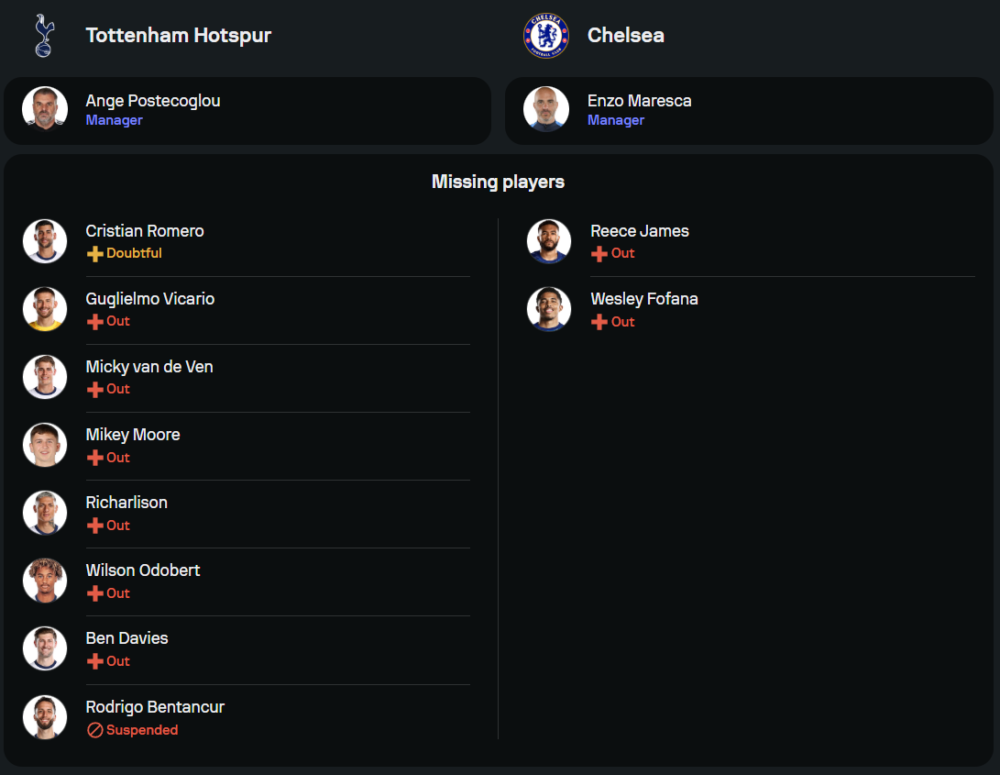 แอนจ์ ปอสเตโคกลู ผู้จัดการทีมไก่เดือยทอง กำลังเจอกับปัญหานักเตะบาดเจ็บหลายราย ทั้ง เบน เดวิส, มิคกี้ ฟาน เดอ เฟ่น, และโกลมือหนึ่งอย่าง กูเยลโม่ วิคาริโอ รวมถึง โรดริโก้ เบนตานกูร์ ที่ยังติดโทษแบน ทำให้ต้องเข็น คริสเตียน โรเมโร่ กลับมาประจำการในแนวรับ ส่วนแนวรุกยังมี ซน ฮึง-มิน และ เบรนแนน จอห์นสัน ที่พร้อมสร้างสรรค์เกมร่วมกับ โดมินิก โซลันกี้ ในระบบ 4-3-3 โดยหวังว่าจะใช้พลังจากเกมในบ้านเป็นแรงกระตุ้น