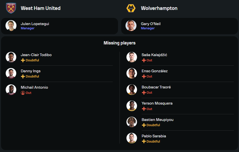 ยูเลน โลเปเตกี กุนซือชาวสเปนของ “ขุนค้อน” อาจเจอกับความกดดันสูงสุดในเกมนี้ หลังผลงานย่ำแย่ต่อเนื่องและตกอยู่ในสถานการณ์เสี่ยงโดนปลด ฟิตเนสของ ฌ็อง-แกลร์ โตดีโบ และ แดนนี่ อิงส์ ยังต้องรอตรวจสอบ แต่ตัวหลักอย่าง จารอด โบเว่น, ลูคัส ปาเกต้า และ โมฮาเหม็ด คูดูส พร้อมลุยในระบบ 4-2-3-1 โดยมี มิคาเอล อันโตนิโอ เป็นหัวหอกคอยล่าตาข่าย