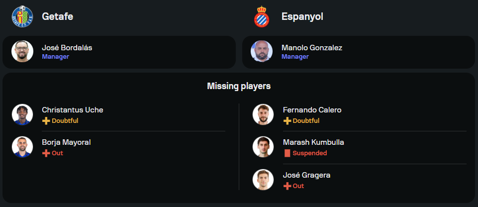 เอสปันญ่อล ทีมอันดับ 18 มีแต้มเท่ากับเกตาเฟ่ แต่ฟอร์มในลีกย่ำแย่ไม่แพ้กัน แม้เกมล่าสุดจะเอาชนะ เซลต้า บีโก้ 3-1 ในบ้านได้ แต่เกมเยือนยังคงเป็นปัญหาใหญ่ โดย 7 เกมเยือนหลังสุด พวกเขาไม่สามารถเก็บชัยชนะได้เลย เสมอ 1 นัด และแพ้ถึง 6 นัด ฟอร์มนอกบ้านเช่นนี้ส่งผลเสียต่อความมั่นใจของทีมอย่างมาก