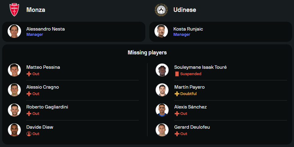 กุนซือ อเลสซันโดร เนสต้า กำลังเผชิญปัญหาสภาพทีมอย่างหนัก ตัวเจ็บยังคงเป็นหน้าเดิม ๆ ได้แก่ อเลสซิโอ คราญโญ่, มัตเตโอ เปสซิน่า และ โรแบร์โต้ กายาร์ดินี อย่างไรก็ตาม ข่าวดีคือการกลับมาของ อาร์มันโด อิซโซ หลังพ้นโทษแบน โดยทีมจะลงเล่นในระบบ 3-4-2-1 พร้อมส่ง มิลาน ยูริช เป็นกองหน้าตัวเป้าคอยล่าสกอร์