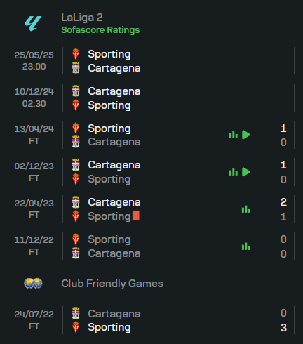 การเผชิญหน้ากันในช่วงที่ผ่านมา ทั้งสองทีมผลัดกันชนะในรูปแบบที่สูสี เกมล่าสุด สปอร์ติ้ง กิฆอน เปิดบ้านเฉือนชัย 1-0 ในฤดูกาลก่อนหน้า ส่วน เอฟซี คาร์ทาเกน่า ก็เคยเอาชนะทีมเยือนได้เช่นกัน หากนับรวม 9 นัดหลังสุด สปอร์ติ้ง กิฆอน เก็บชัยไป 4 ครั้ง เสมอ 2 และแพ้อีก 3 ครั้ง ด้วยความใกล้เคียงในฟอร์มการเล่น แมตช์นี้จึงยากที่จะคาดเดา แต่หากมองจากมุม ทีเด็ดบอล ทีมเยือนยังดูน่าเชื่อถือกว่าเล็กน้อย