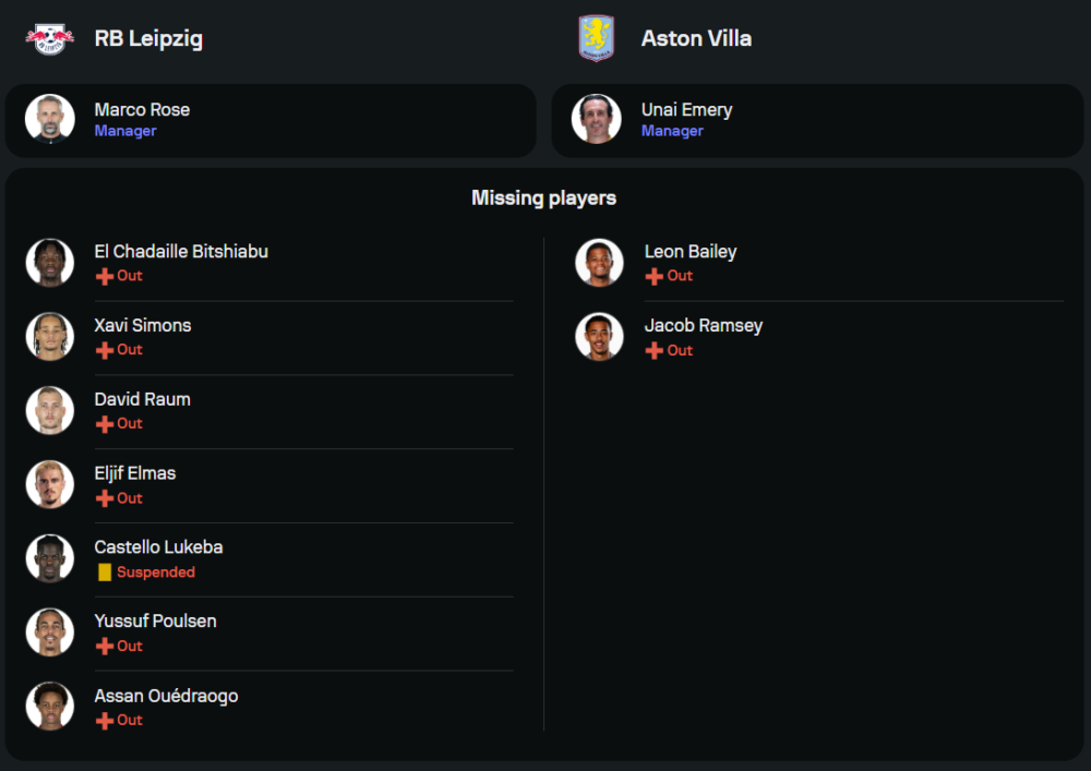 เกมนี้ถือเป็นศึกชี้ชะตาสำหรับทั้งสองทีม แอร์เบ ไลป์ซิก จำเป็นต้องบุกเต็มที่เพื่อลุ้นเก็บ 3 คะแนนแรกในรายการนี้ แม้จะมีปัญหาในแนวรุก แต่พวกเขายังมีความหวังจากการเล่นในบ้าน ขณะที่ แอสตัน วิลล่า ที่เน้นความรัดกุมและสวนกลับอันเฉียบคม มีโอกาสสร้างปัญหาให้เจ้าบ้านได้ไม่น้อย ด้วยฟอร์มยุโรปที่ยังดูดีกว่า