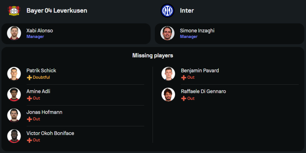 ทั้งสองทีมเคยพบกันเพียงครั้งเดียวในรายการนี้ โดยในเกมนั้น อินเตอร์ มิลาน เปิดบ้านเฉือนเอาชนะ ไบเออร์ เลเวอร์คูเซิน ไปได้ 2-1 แต่ในครั้งนี้ การแข่งขันในสนามของเลเวอร์คูเซินย่อมไม่ใช่งานง่าย ทีมเจ้าบ้านพร้อมแก้มือในเกมสำคัญที่อาจชี้ชะตาโอกาสเข้ารอบ เชื่อว่าเกมนี้จะเต็มไปด้วยการวางแผนที่รัดกุมและ ทีเด็ดบอล จากทั้งสองทีม