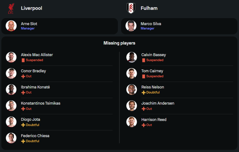 กุนซือ อาร์เน่อ สล็อต จะต้องรับมือกับปัญหาผู้เล่นบาดเจ็บและติดโทษแบน โดยเฉพาะ อเล็กซิส แม็ก อัลลิสเตอร์ ที่จะพลาดลงสนามแน่นอน แต่ยังคงมีตัวหลักอย่าง โมฮาเหม็ด ซาล่าห์ และ หลุยส์ ดิอาซ ที่พร้อมล่าสกอร์ในระบบ 4-2-3-1 เกมรุกที่หนักแน่นของพวกเขายังคงเป็นอาวุธสำคัญที่คู่แข่งต้องระวัง